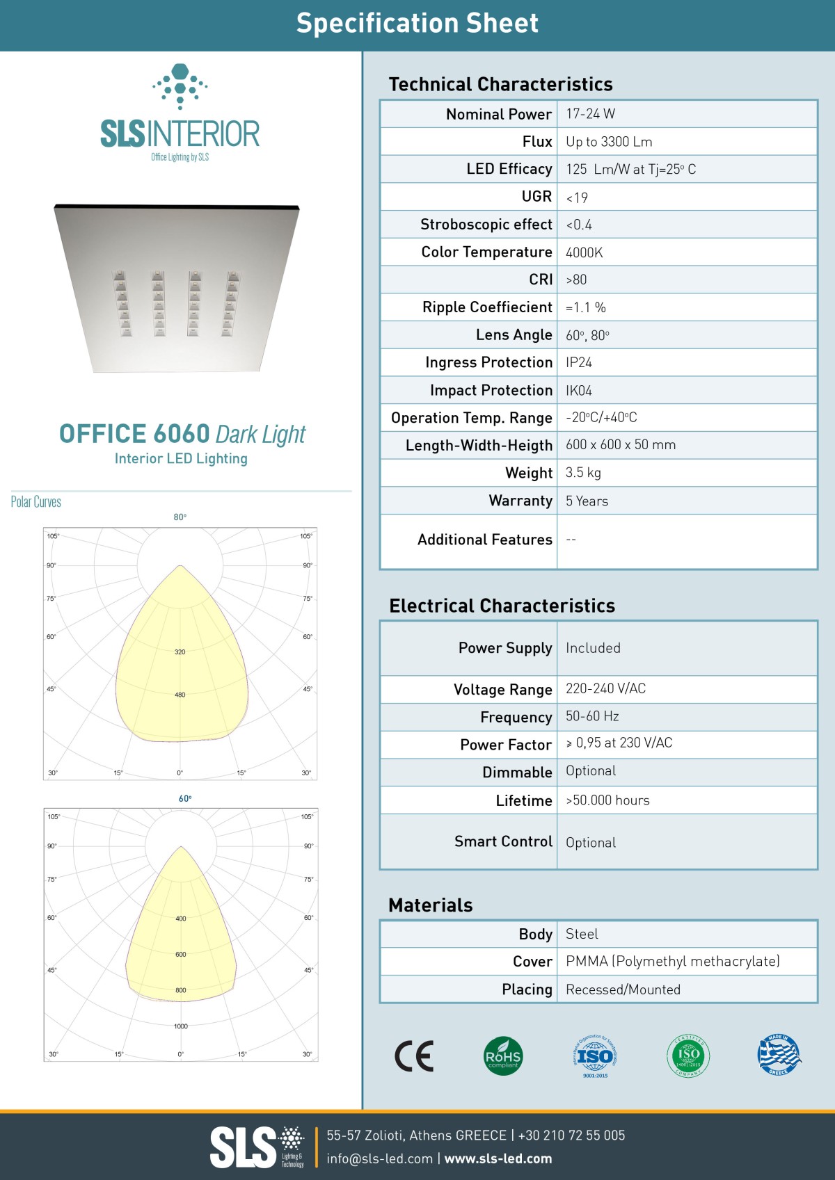Το Office 6060 Dark light επίτοιχο/χωνευτό αποτελεί ένα φωτιστικό νέας γενιάς, από αλουμίνιο, με κομψή σχεδίαση και φωτισμό υψηλής απόδοσης. Συνδυάζει την τεχνολογία Dark light στο φωτισμό γραφείων, κάνοντας χρήση οπτικών, αντί πολυκαρβονικών που χρησιμοποιούν τα ευρέως διαδεδομένα φωτιστικά της αγοράς. Τα πολυκαρβονικά έχουν απόδοση 70%, (δηλαδή μειώνουν την εκπεμπόμενη φωτεινή ενέργεια κατά 30%) και τη διαχέουν σε μια ευρεία και μη ωφέλιμη περιοχή έως τις 150ο.. Το Office 6060 Dark light έχει απόδοση της τάξης του 96% σε ό,τι αφορά το φωτιστικό αποτέλεσμα, ενώ έχει την δυνατότητα να κατευθύνει το φως στις 60ο. και στις 90ο. .Η διαφορά αυτή στην απόδοση, εξοικονομεί πολύ περισσότερη ενέργεια σε Watt σε σχέση με τα φωτιστικά με πολυκαρβονικό. Ο όρος Dark light σημαίνει ότι δεν είναι εμφανής η πηγή φωτός και συνεπώς έχει χαμηλή θάμβωση (glare), επιτυγχάνοντας χαμηλό UGR. Τέλος το flickering διατηρείται κάτω από το 1% με τα ηλεκτρονικά που χρησιμοποιούνται σε αυτό.