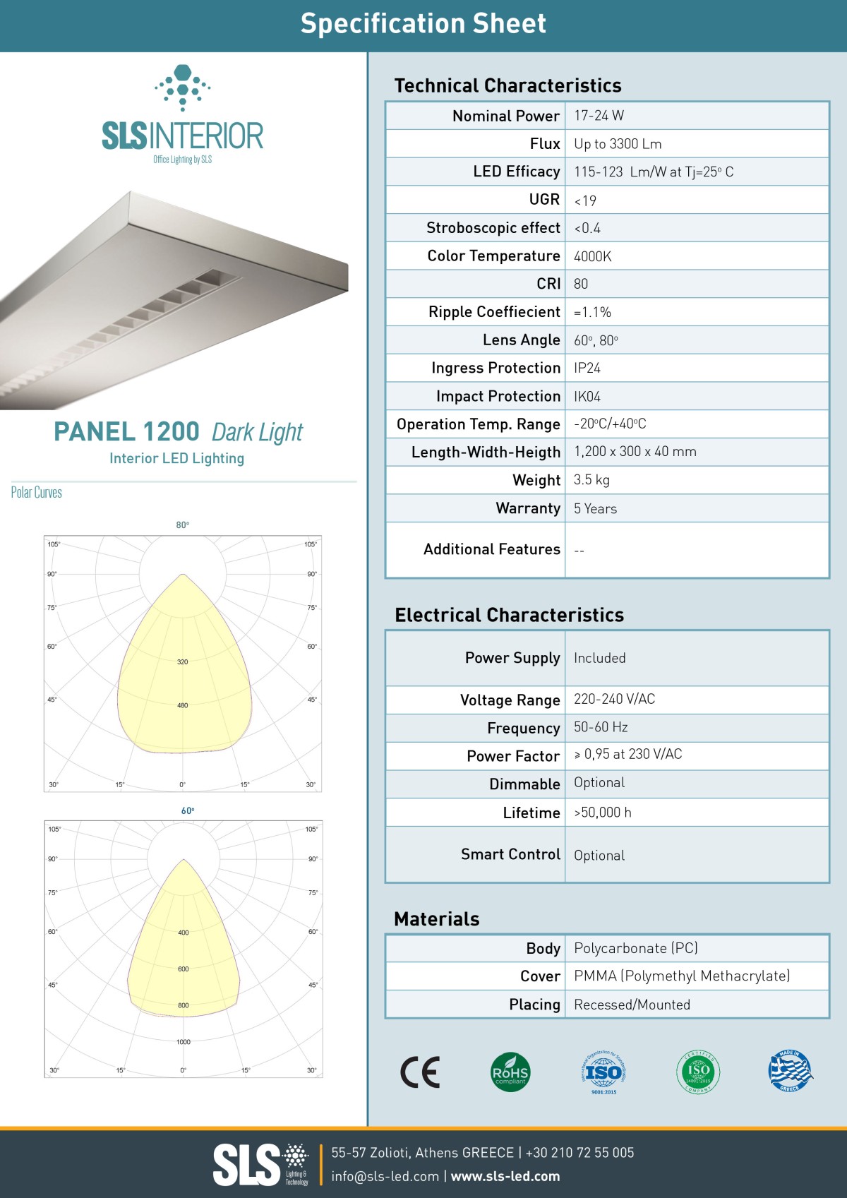 Το Office 1200 Dark light χωνευτό/επίτοιχο αποτελεί ένα φωτιστικό νέας γενιάς, από αλουμίνιο, με κομψή σχεδίαση και φωτισμό υψηλής απόδοσης. Συνδυάζει την τεχνολογία Dark light στο φωτισμό γραφείων, κάνοντας χρήση οπτικών, αντί πολυκαρβονικών που χρησιμοποιούν τα ευρέως διαδεδομένα φωτιστικά της αγοράς. Τα πολυκαρβονικά έχουν απόδοση 70%, (δηλαδή μειώνουν την εκπεμπόμενη φωτεινή ενέργεια κατά 30%) και τη διαχέουν σε μια ευρεία και μη ωφέλιμη περιοχή έως τις 150°.